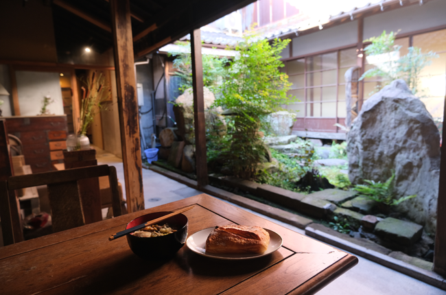 宿の中庭で、ゆっくりとした朝の時間。