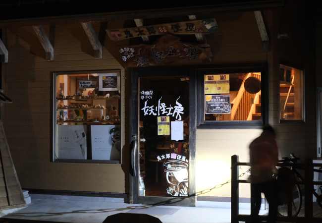 夜だったので、一度通り過ぎてしまいましたが、無事に目的地の「妖怪工房」さんに到着できました。